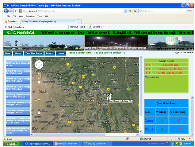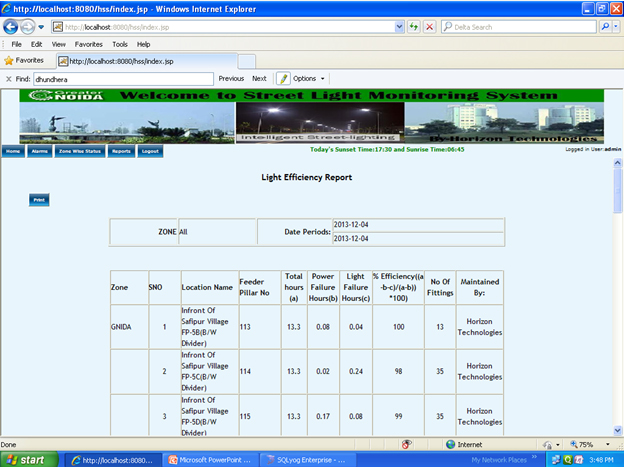 This application developed in 2 tier architecture, This application is developed by our Expert Team,This application developed in Java/J2ee plateform. This system is helping for monitoring the street lights and makes a single view report for all locations. Efficiency Report calculating efficiency of lights in ON duration.